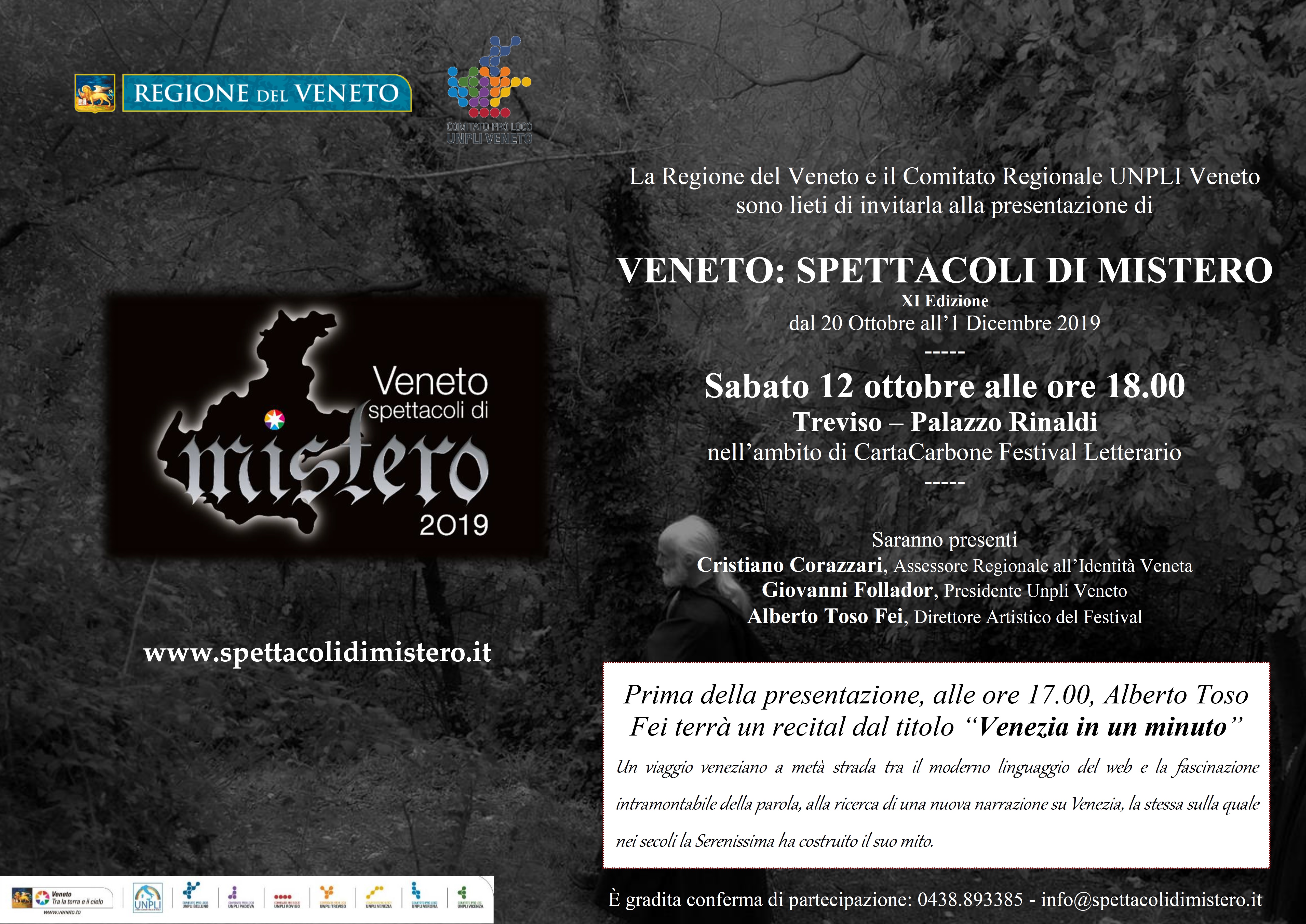 Con questa consapevolezza Regione del Veneto e UNPLI Veneto hanno dato vita a “Veneto: Spettacoli di Mistero”, il festival dedicato interamente ai luoghi leggendari e misteriosi della regione. Un evento giunto oramai all’undicesima edizione che, grazie al lavoro di centinaia di artisti e al supporto di migliaia di volontari, ogni anno mette in scena quasi 200 racconti della tradizione ambientati tra piazze, ville, teatri, castelli, boschi e zone di mare.